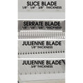 | Blade Types & Thickness Settings | Slice Blade: 1/8", 1/4", 3/8" Serrate Blade: 1/8", 1/4", 3/8" Julienne Blade: 1/8" Julienne Blade: 3/8" |