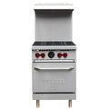 Four 28,000 BTU open burners plus a 30,000 BTU space saver oven for busy service.