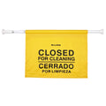 This bright yellow safety hanging sign displays "Closed for Cleaning" in both English and Spanish, ensuring every visitor understands the closure regardless of language.
