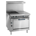 A heavy-duty 36-inch range that pairs high-BTU open burners with rear hot tops and an open cabinet base for fast, flexible production on the line.