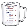 The Cambro Camwear 1-cup measuring cup features externally marked graduations that are clearly visible from outside the cup. Color-coded markings make it easy to read the right unit at a glance.