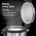 - Heated, hinged lid helps hold heat and moisture while saving counter space.
