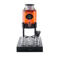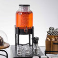 TableCraft 10090 glass beverage dispenser filled with orange drink, displayed on a black industrial riser stand alongside mason jar glasses and black straws