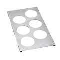 The TableCraft T6 is a six-hole stainless steel squeeze bottle holder engineered for fast-paced commercial kitchens, salad bars, and condiment stations. Constructed from durable 18/8 stainless steel, it securely organizes up to six 12 oz., 16 oz., or 24 oz. squeeze bottles through precision machine-cut round holes measuring 2 15/16 in diameter. Designed to drop directly into a 1/3 size food pan (sold separately), the integrated lip keeps the holder flush and stable during busy service. Its low-profile, dishwasher-safe design simplifies sanitation and streamlines workflow in high-demand foodservice environments.
