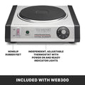 The Waring WEB300 commercial cast-iron single burner is a heavy-duty, portable electric hot plate built for omelet stations, catering, and buffet lines. Its 1300W heating element delivers quick heat-up and even heat distribution through a cast-iron burner plate. A brushed stainless steel housing and non-slip rubber feet help it hold up in busy service environments. Independent, adjustable thermostat controls with ON and READY indicator lights make it easy to dial in and monitor heat.
