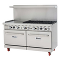 A 60 inch natural gas restaurant range that combines open-burner flexibility with a dedicated griddle and dual ovens for efficient production.