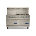 Keep the line moving with a 60-inch gas range that supports sautéing, searing, and griddle work up top while baking or roasting below.