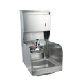 Space Saver Hand Sink, wall mount, 9" wide x 9" front-to-back x 5" deep bowl, 4" OC splash mount heavy duty 3-1/2" mini gooseneck spout, marine edge, towel dispenser (accommodates BK-MFPT "C" fold towels), deck mount soap dispenser, side splashes on left & right, includes basket drain & wall mounting hardware, 304 stainless steel construction, NSF