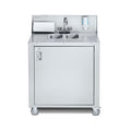Portable Sink, hot & cold water, (2) 6" wide x 12" front-to-back x 5" deep bowls, (2) 5 gallon removable fresh water tanks & (2) 7-1/2 gallon removable waste water tanks, soap & paper towel dispensers, electric water pump & hands-free foot pump operation,