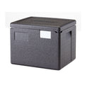 Cam GoBox® Insulated Food Pan Carrier, 23.6 qt., top load, holds (1) GN 1/2 sized food pan up to 8 deep, ergonomic handles, maintains safe temperature for hot or cold holding for up to 4 hours, dishwasher safe, drip resistant, stackable, lightweight, impact resistant, eco-friendly, 100% recyclable, EPP (expanded polypropylene foam), black
