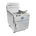 Fryer, Gas, Natural, 30-lbs. . countertop, single pot, 30-lbs. fat capacity, 13,250 BTU per burner, stainless steel construction, stainless steel fry pot with drain valve & extension pipe, (2) nickel-plated fry baskets with insulated handles, stainless steel tube burners inside rectangular heat chambers, thermostat protection, 53,000 BTU, cETLus