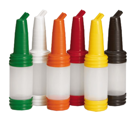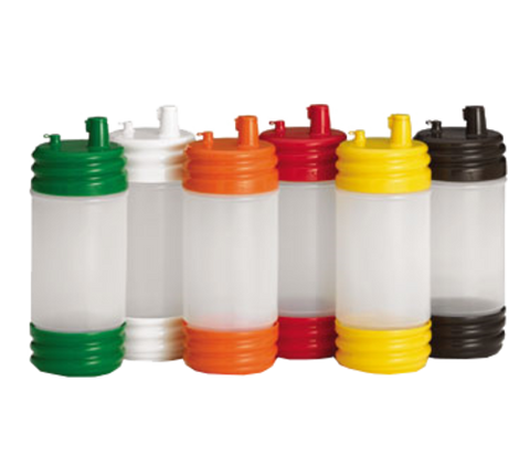N32A Tablecraft 32 Oz. Pourmaster Assorted Color Plastic Bottle w/ Long Neck Top & Cap