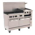 A high-capacity gas range that combines open-top burner power with a dedicated griddle-broiler surface and two standard ovens below.