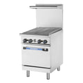 A compact 24 inch Radiance range that combines a full-width radiant charbroiler top with a stainless steel standard oven base.