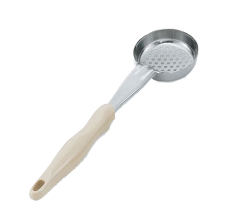 Spoodle®, 1-piece heavy duty, perforated round bowl, handle coded ivory, equipped with all-natural antimicrobial, 3 oz. (88.7ML), 18/8 304 stainless steel, ergonomic design high temperature textured nylon handle heat resistant to 450°F (232°C), built-in stopper notch, capacity stamped on shaft, 13-1/16" overall L, 2-15/16"bowl diameter, limited warr, NSF, imported, Jacob's Pride® Collection, Limited Lifetime Warranty