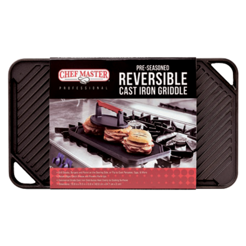 The Chef Master 90202 reversible cast iron griddle arrives fully pre-seasoned, so it is ready to use right out of the box. No break-in required -- just set it on your stovetop and start cooking.