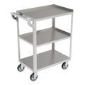 Bus Cart, small, (3) shelves with 13 clearance, 27W x 15-1/2D x 33-1/2, shelf size approximately 24 x 15-1/2, 200 lb. load capacity, angle leg, 5 swivel casters, 18 gauge stainless steel construction, ETL, Welded body, Handle and casters not assembled for shipment. (Ships LTL)