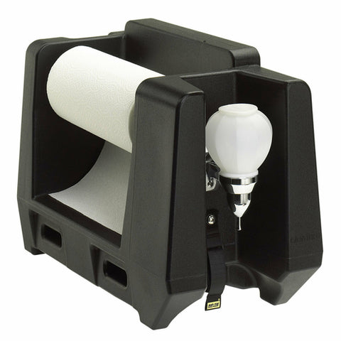 The Cambro HWAPR110 Handwash Accessory transforms any compatible Camtainer into a fully functional hand washing station. Built in durable polyethylene, this black accessory keeps soap, paper towels, and a dispenser lever all in one compact unit.