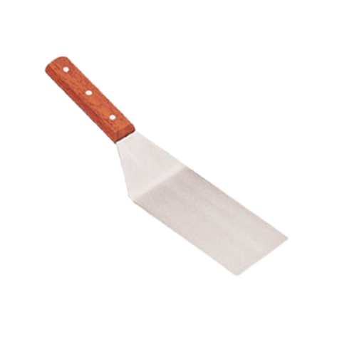 The Thunder Group SLTWBT075 turner is crafted from 420 stainless steel with a smooth satin finish, delivering reliable performance whether you're flipping burgers on a flat-top griddle or serving delicate crepes on a range. The riveted rustic wood handle provides a secure, comfortable grip while keeping your hand comfortably away from the cooking surface.
